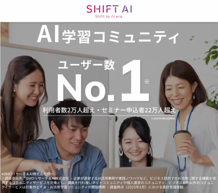 | SHIFT AI | (株)SHIFT AI | ビジネス活用 | AI活用コミュニティ, ウェビナー, 動画教材 | 月額 21,780円 (税抜)~ | なし | AIのビジネス活用を学びたい人, 仲間と交流したい人 |