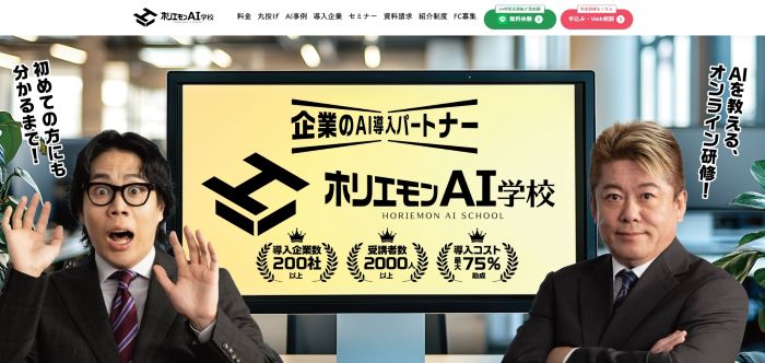 | ホリエモンAI学校 | ホリエモンAI学校(株) | ビジネス活用 | 実務活用, ビジネス構築, AI検定 | 入学金162,800円 + 月額16,280円 | 法人 | 業務効率化したいビジネスパーソン, 自己管理できる人 |