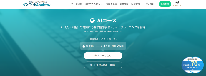 未経験からAIエンジニアを目指す方、E資格取得を目指す方、データ分析や自然言語処理のスキルを体系的に学びたい方に適しています。