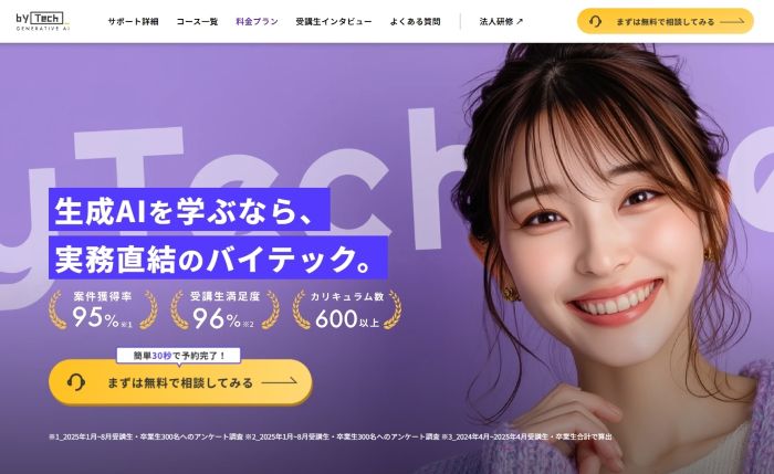 by Tech(バイテック)は、「育児中のママ向け! 生成AI×SNSの副業スキルを1ヶ月で習得できる」と、ターゲットを非常に明確に絞り込んでいるスクールです。